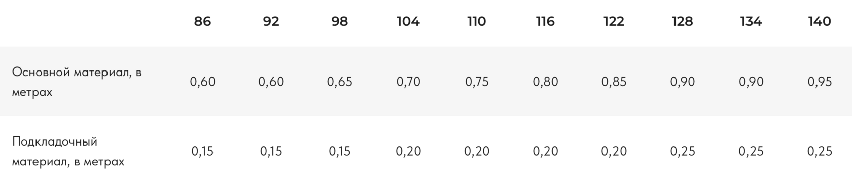 Важно! В таблице дан расход основного материала без учета усадки и совмещения рисунка.