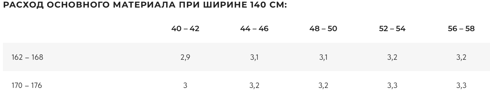 Важно! Расход основного материала дан без учета усадки и совмещения рисунка. Если вы предпочитаете кроить с минимальными выпадами или ширина вашего материала отличается, рекомендую распечатать и разложить выкройку перед покупкой материала.