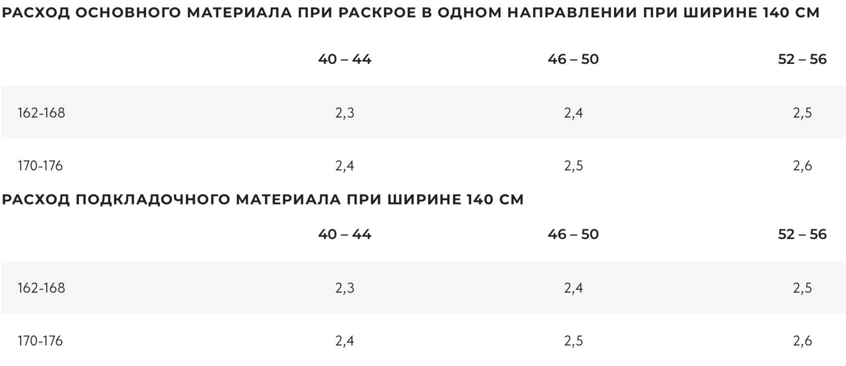 Важно! Расход основного материала дан без учета усадки и совмещения рисунка. Если вы предпочитаете кроить с минимальными выпадами или ширина вашего материала отличается, рекомендую распечатать и разложить выкройку перед покупкой материала.