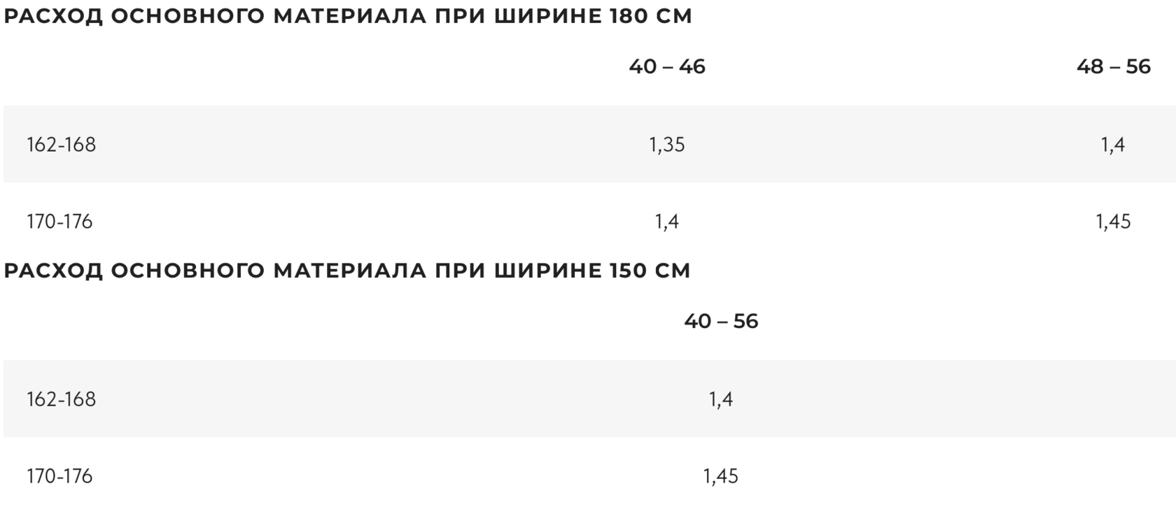 Важно! Расход основного материала дан без учета усадки и совмещения рисунка. Если вы предпочитаете кроить с минимальными выпадами или ширина вашего материала отличается, рекомендую распечатать и разложить выкройку перед покупкой материала.